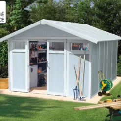Votre abri de jardin en PVC Utility 11 de chez Grosfillex est de fabrication française. Ses dimensions hors tout sont : 3,70 x 4,07 x 2,50 m (l,l,h). La surface utile est de 10,6 m². Les murs font 26 mm d’Ă©paisseur pour une hauteur de 1,88 m. La porte double vitrĂ©e est livrĂ©e avec sa poignĂ©e et une serrure Ă clĂ©. Elle mesure 1,45 x 1,80 m (l,h) et les vitres font 0,562 x 0,272 m (l,h). Deux lucarnes encadrent la porte et mesurent : 68,2 x 27,5 cm (l,h).