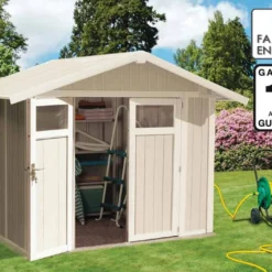 L’abri de jardin est livrĂ© avec un kit de fixation pour installer facilement vos Ă©tagères ou autres objets dans votre abri de jardin. Il est livrĂ© sans plancher. Vous trouverez un kit d’ancrage dans vos accessoires qui vous permettra de fixer votre abri au sol. La garantie est de 10 ans.