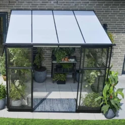 La serre murale Qube Lean-to 68 signée Halls est équipée d’une structure en aluminium à la finition noire, moderne, qui devrait faciliter son intégration dans votre extérieur. Solide et très résistant face à la corrosion et aux intempéries, l’aluminium est un matériau qui n’exige aucun entretien ni traitement particulier, même après plusieurs années. Il s’agit également d’un métal assez léger qui simplifiera la manipulation des pièces qui constituent l’armature au moment de leur assemblage.