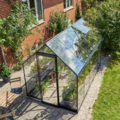 Afin d’assurer la bonne aération de cette serre en verre, cette dernière est équipée de deux lucarnes de toit. Une porte coulissante de 60 cm de large vous permettra quant à elle de pénétrer aisément à l’intérieur de la serre. Notez également la présence d’un système de gouttière conçu pour faciliter l’évacuation ou la collecte de l’eau de pluie en cas d’averse.