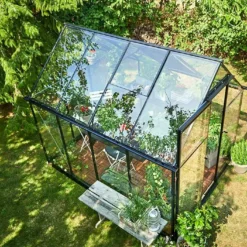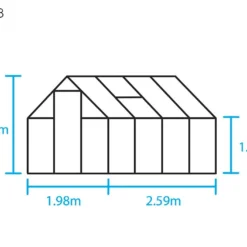 Cette serre en verre possède donc une solide armature de 1,98 x 2,59 m faite d’aluminium peint en noir. L’ensemble de la structure occupera alors une surface de 5,1 m² dans votre jardin. Afin de faciliter l’accès à l’intérieur de la serre, cette dernière s’est vue dotée d’une porte coulissante de 60 cm de large. Une fois ouverte, cette porte pourra contribuer à la bonne ventilation de la serre, en complément des deux fenêtres de toit également présentes.