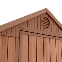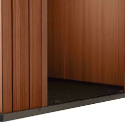 L’abri de jardin Darwin 46 de chez Keter s’est vu doté d’une finition imitation bois des plus convaincantes. Il est toutefois entièrement conçu en résine (polypropylène extrudé), un matériau résistant aux intempéries, traité anti-UV et qui ne demande aucun entretien particulier. Son design moderne lui permettra par ailleurs de s’intégrer dans des extérieurs de styles aussi divers que variés.