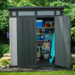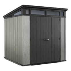 L’abri de jardin carré mesure 2,18 m de longueur et de largeur et 2,26 m de hauteur (dimensions hors tout) pour une surface de 4,75 m². Il dispose d’une toiture une pente vers l’arrière imitant les tuiles en 3 dimensions. La toiture est en polypropylène et peut supporter jusqu’à 125 kg/m² de neige.
