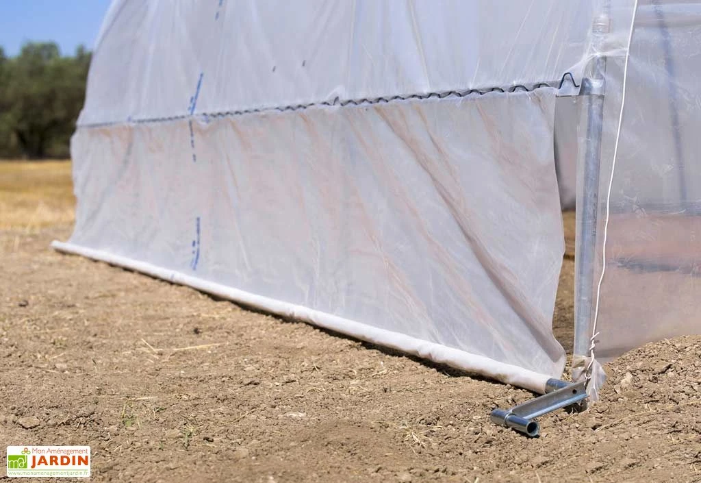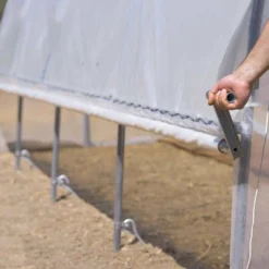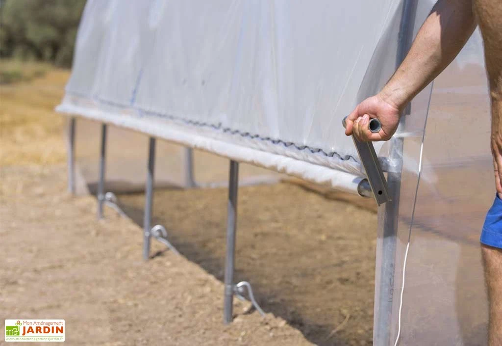 L’aération se place au choix à gauche ou à droite de la serre et s’ouvre jusqu’à 80 cm de hauteur. L’enroulement de la bâche est simple grâce à la manivelle fournie dans le kit. Il est possible de mettre un kit de chacun des côtés de la serre.