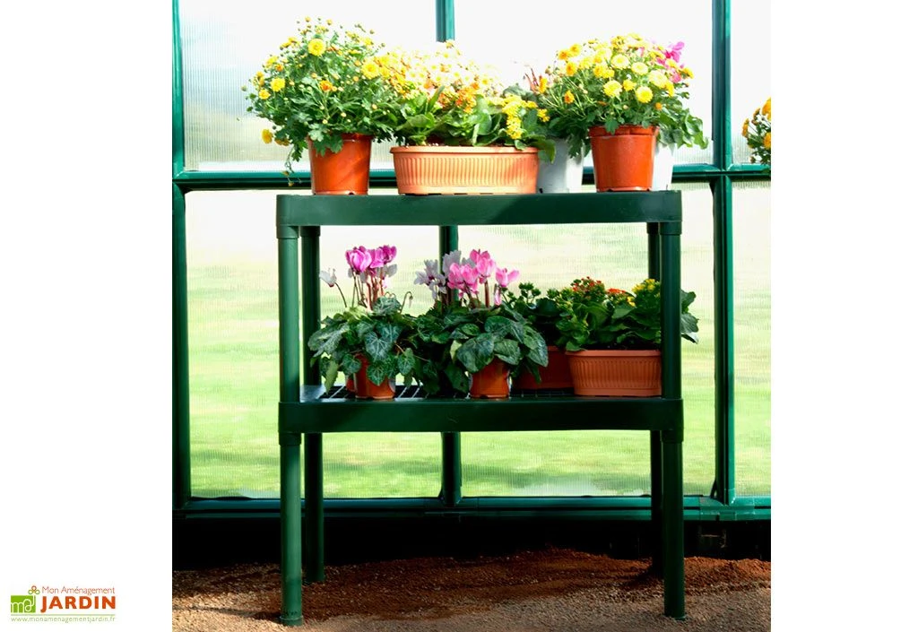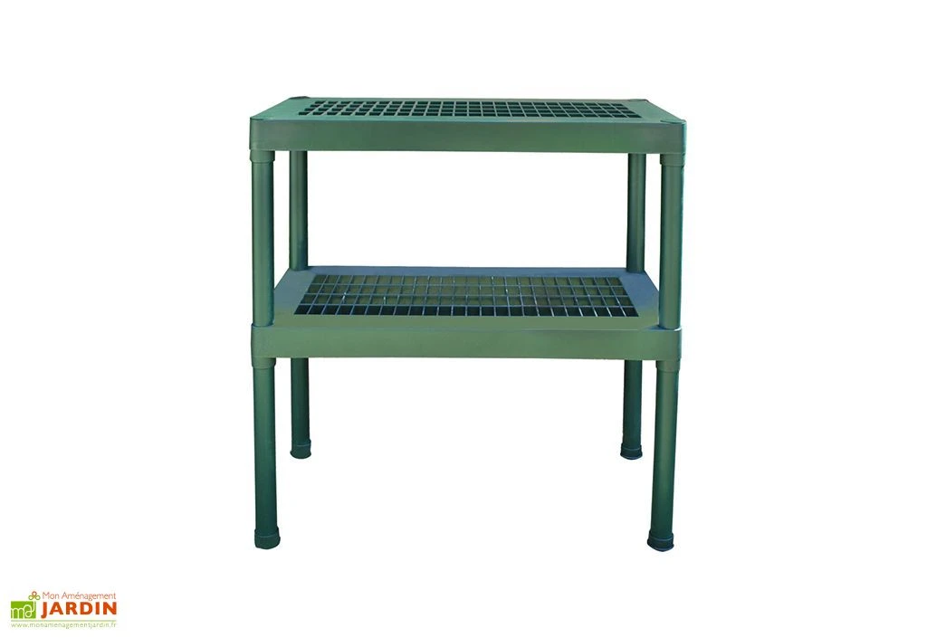 Cette double Ă©tagère Palram-Canopia est fabriquĂ©e en polypropylène, ce qui la rend Ă la fois solide et lĂ©gère. Facile Ă nettoyer, elle est perforĂ©e afin de faciliter la circulation de l’air, mais Ă©galement le drainage de l’eau qui pourrait s’écouler de vos pots. Très pratique, cette Ă©tagère affiche des dimensions de 40 x 80 cm, pour 85 cm de haut. Elle vous permettra d’organiser l’espace intĂ©rieur de votre serre de jardin.Â