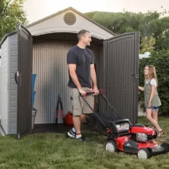 Votre abri de jardin en rĂ©sine beige et amande de chez Lifetime est un produit de haute qualitĂ© avec sa double paroi en polyĂ©thylène haute densitĂ© (HDPE) de 23 mm d’Ă©paisseur. Le toit est en double paroi HDPE Ă©galement et possède une pente de 50%.