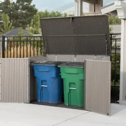 Très pratique, ce coffre de rangement extérieur est doté d’un couvercle monté sur vérins et d’une double porte frontale permettant de faciliter le stockage des objets relativement encombrants. Cette double porte lui permettra par ailleurs de faire office de cache-poubelles, ce dernier pouvant accueillir deux bennes. A noter également, la possibilité de verrouiller le couvercle ainsi que les portes afin de sécuriser le contenu du coffre (cadenas non inclus).