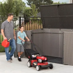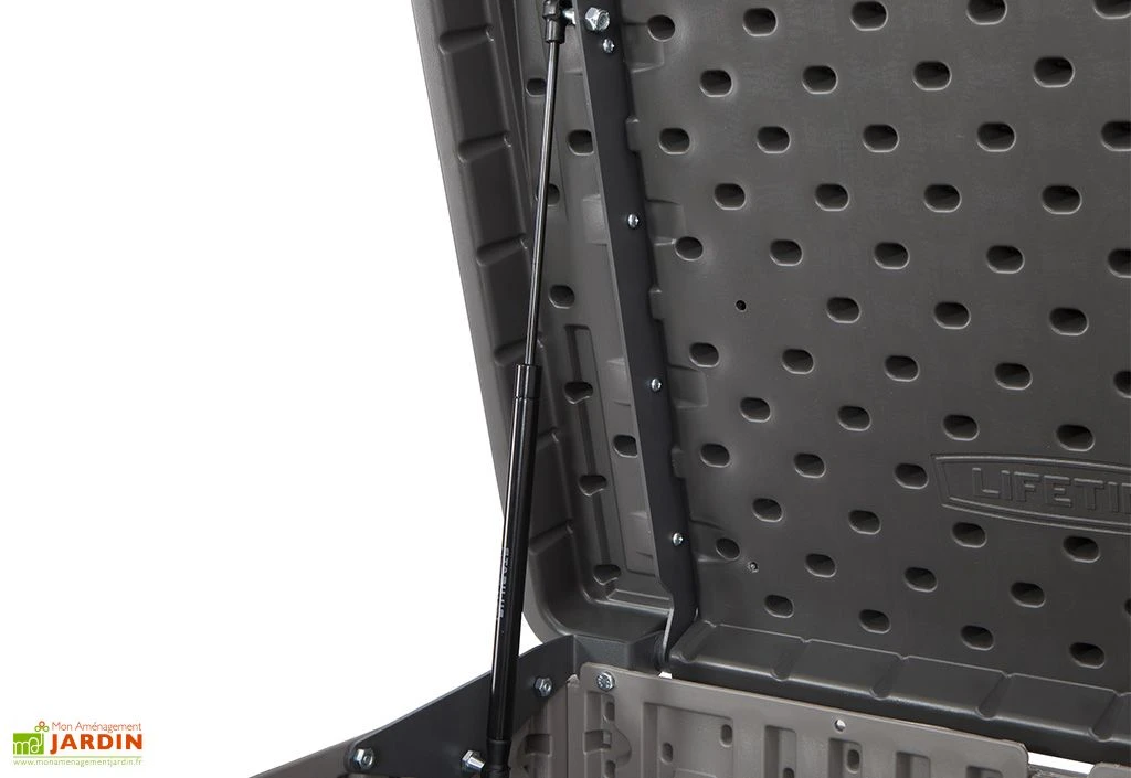Ce coffre de jardin de la marque Lifetime est entièrement conçu en polyéthylène haute densité (PEHD), un matériau robuste qui résistera aux chocs, aux intempéries et aux rayons UV. Il ne décolorera donc pas et conservera sa finition effet bois pendant de nombreuses années, le tout sans exiger d’entretien particulier. Sa finition imitation bois lui permettra de plus de s’intégrer plus facilement dans votre jardin. Toute la quincaillerie est pour sa part conçue en inox afin de ne pas rouiller au fil des saisons.