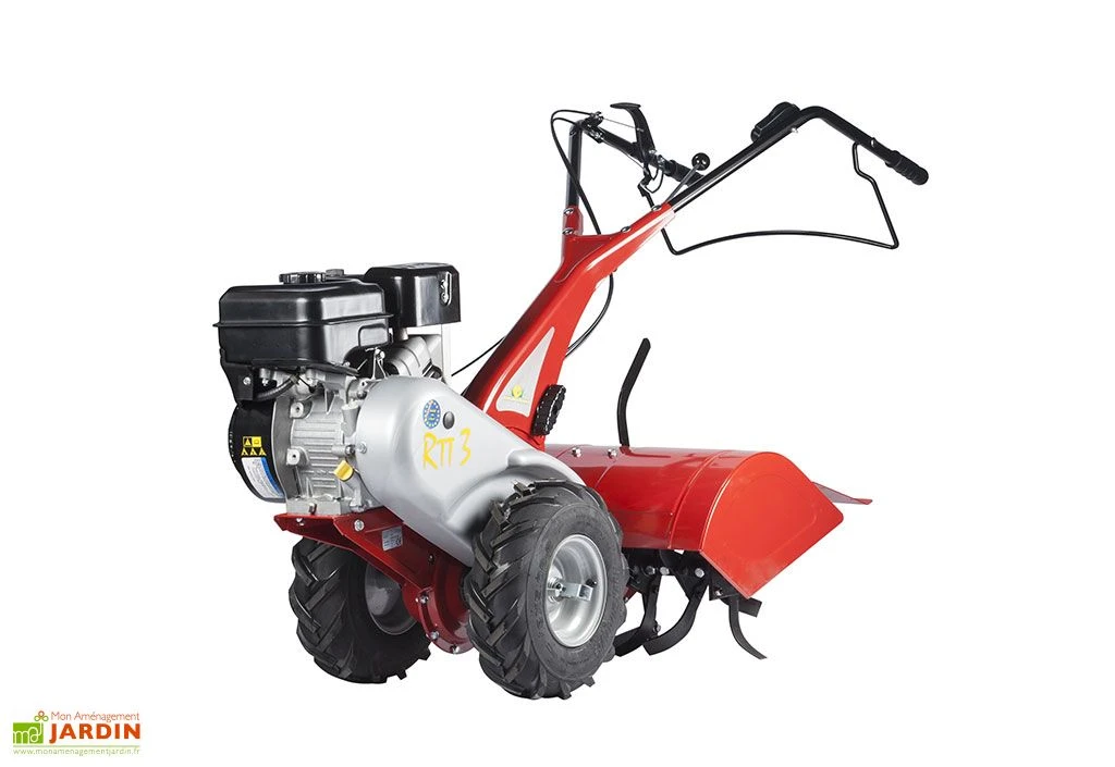 Idéal pour la culture maraîchère, ce motoculteur thermique de chez Eurosystems vous permettra de travailler le sol en profondeur. Il intègre un moteur Briggs & Stratton Vanguard de 205 CC, possède une transmission à courroie et chaîne et dispose de deux vitesses de travail ainsi que d’une marche arrière. Ce motoculteur est également doté d’un système de débrayage des roues grâce auquel vous pourrez déplacer l’appareil plus aisément une fois le moteur arrêté.
