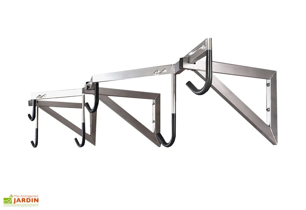 Ce range-vélo mural du fabricant français Mottez permettra de ranger jusqu’à 6 vélos sans pour autant encombrer le sol de votre garage ou de votre abri de jardin. Il dispose d’une structure robuste de 2 mm d’épaisseur fabriquée en acier zingué comprenant 6 crochets gainés de 16 mm de diamètre. Tous les crochets sont décalés afin d’obtenir un maximum de gain de place et pour pouvoir ainsi suspendre les vélos en toute simplicité.