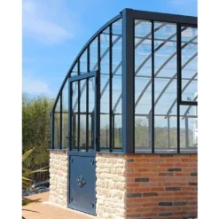 La porte est Ă©galement dotĂ©e d’un verre trempĂ© sur la moitiĂ© supĂ©rieure, afin de toujours laisser pĂ©nĂ©trer la lumière Ă l’intĂ©rieur de la serre. Elle est aussi Ă©quipĂ©e d’une serrure.