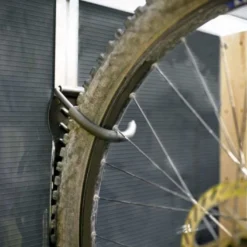 Une fois l’installation du porte vĂ©lo effectuĂ©e, il vous suffit d’accrocher votre roue avant de vĂ©lo au crochet et de poser la roue arrière contre le mur afin de profiter d’un rangement vertical peu encombrant.Â