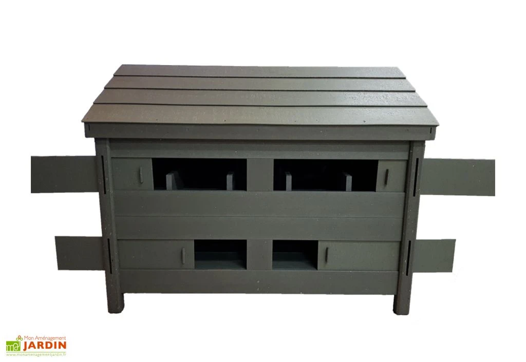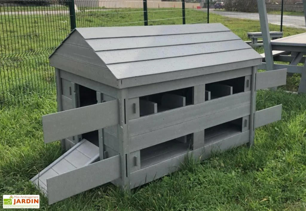 Fabriqué en France, ce grand poulailler est entièrement conçu en Polymab, un matériau composite obtenu grâce au recyclage de briques alimentaires type Tetra Pak. Près de 34 000 briques ont été nécessaires pour pouvoir fabriquer ce produit, ce qui fait de ce type de matériau une alternative écologique qui n’a de plus rien à envier au bois traditionnellement utilisé pour la conception des poulaillers puisqu’il s’agit d’une matière imputrescible, extrêmement robuste et facile à nettoyer.