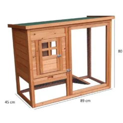 Le poulailler en bois de chez Habrita est composĂ© d’un espace nuit, d’une grande volière et permet d’abriter deux poules. Il est en pin de 10 mm d’épaisseur non traitĂ© sur lequel vous devrez appliquer un fongicide. Ses dimensions au sol sont de 89 x 45 cm pour des dimensions hors tout de 100 x 50 x 80 cm (l,l,h).Â