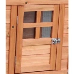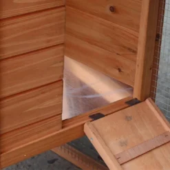 Les poules pourront profiter d’une rampe d’accès de 70 x 18 cm leur permettant de se rendre aisĂ©ment dans la partie nuit. La partie volière est fermĂ©e grâce Ă un grillage de 1 x 1 cm de maille et une grande porte de 53 x 76 cm (l,h). La partie nuit dispose Ă©galement d’une porte, de 20 x 15 cm (l,h). Les deux peuvent ĂŞtre fermĂ©es grâce Ă un loquet mĂ©tallique. Le toit est recouvert d’une couverture bitumĂ©e verte assurant l’Ă©tanchĂ©itĂ© du poulailler.