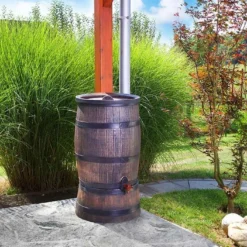 La cuve de récupération d’eau de pluie de Roto mesure 42 cm de diamètre pour 54 cm de hauteur et dispose d’une contenance de 50 litres. Elle imite à la perfection tonneau en bois, type tonneau de vin. L’illusion est parfaite et elle s’intègre aisément dans le jardin.