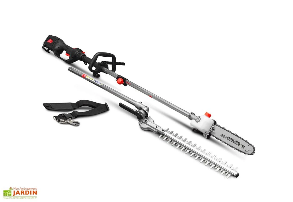 Cet outil de jardin 2 en 1 de la marque Elem Garden associe une scie à ébrancher et un taille-haie. Il s’agit d’un modèle électrique d’une puissance de 1000 W grâce auquel vous pourrez à la fois tailler vos haies et élaguer vos arbres en toute simplicité. Sa perche vous permettra en effet d’atteindre aisément des branches relativement hautes et son faible poids vous assurera maniabilité et confort d’utilisation.