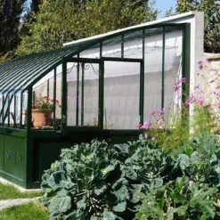 La serre ancienne Chambord mesure 605 x 280 x 270 cm (l,l,h), elle vous offre donc une grande superficie de 16,94 m². La serre adossée est en aluminium laqué avec une peinture sablée (plusieurs coloris sont disponibles, d’autres laquages sont faisables sur demande). Les parois et le toit sont en verre trempé de 4 mm d’épaisseur. Le toit se constitue de petites tuiles pour accentuer encore davantage ce style victorien du début du XXème siècle.