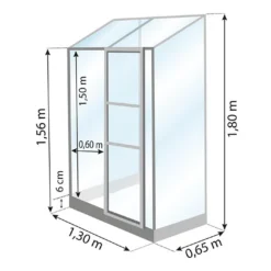 La serre de jardin de chez Lams est une petite serre adossée offrant une surface inférieure à 1 m², idéale pour les petits espaces : terrasses, petits jardins, balcons… Elle mesure 65 cm de profondeur pour une longueur de 130 cm (au sol) et une hauteur de 180 cm. Ses dimensions hors tout sont de 77 x 131 cm.