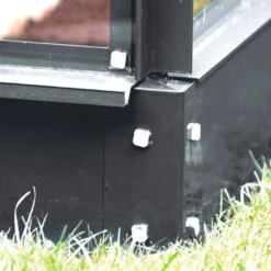 La serre en verre comprend une porte coulissante de 60 x 151 cm (l,h) et une base en acier galvanisé. Une nouvelle fois pensée pour les petits espaces, la porte coulissante prend peu de place et offre ainsi une meilleure résistance au vent puisqu’elle ne claque pas. La base en acier galvanisé rehausse la structure de 6 cm et lui apporte une stabilité et une solidité supplémentaire. Elle permet également de monter la serre directement sur la pelouse ou sur la terre, sans avoir à créer de dalle de béton.