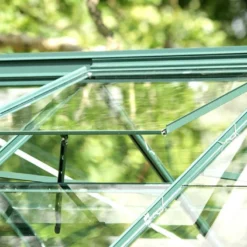 Les parois et la toiture de la serre en alu sont en verre trempé securit d’une épaisseur de 3 mm. Le verre trempé securit est solide et résistera parfaitement aux chocs. S’il vient à casser il se brise en petits morceaux non coupants pour plus de sécurité. Les parties arrondies sont quant à elles en plexiglass. Tous les vitrages sont fixés par des clips à ressorts et la serre est parfaitement étanche grâce aux joints en caoutchouc.