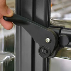 La serre en alu est équipée d’une grande double porte de 114,5 x 194,5 cm, à ouverture battante. Son seuil bas permet d’en faciliter l’accès. Une à quatre fenêtres sont incluses sur le toit pour ventiler l’intérieur de la serre et maitriser le taux d’humidité. Un système de gouttière intégrée canalise l’eau de pluie et vous permet de la récupérer si vous souhaitez installer une descente de gouttière.