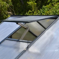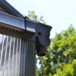 Palram-Canopia a dotĂ© sa serre de trois fenĂŞtres de toit dont l’ouverture, automatisĂ©e, se dĂ©clenchera lorsque la tempĂ©rature intĂ©rieure atteint les 12 Ă 15 °C. Ces fenĂŞtres, complĂ©tĂ©es par une ventilation Ă volets mobiles, permettent de rĂ©guler le taux d’humiditĂ© et la tempĂ©rature, mais Ă©galement de garantir la bonne circulation de l’air. Notez enfin la prĂ©sence de gouttières de 3,2 cm de diamètre pour l’évacuation ou la rĂ©cupĂ©ration de l’eau de pluie. Vous pourrez ainsi la rĂ©utiliser pour l’arrosage de vos cultures.Â