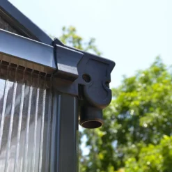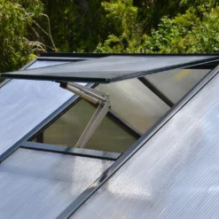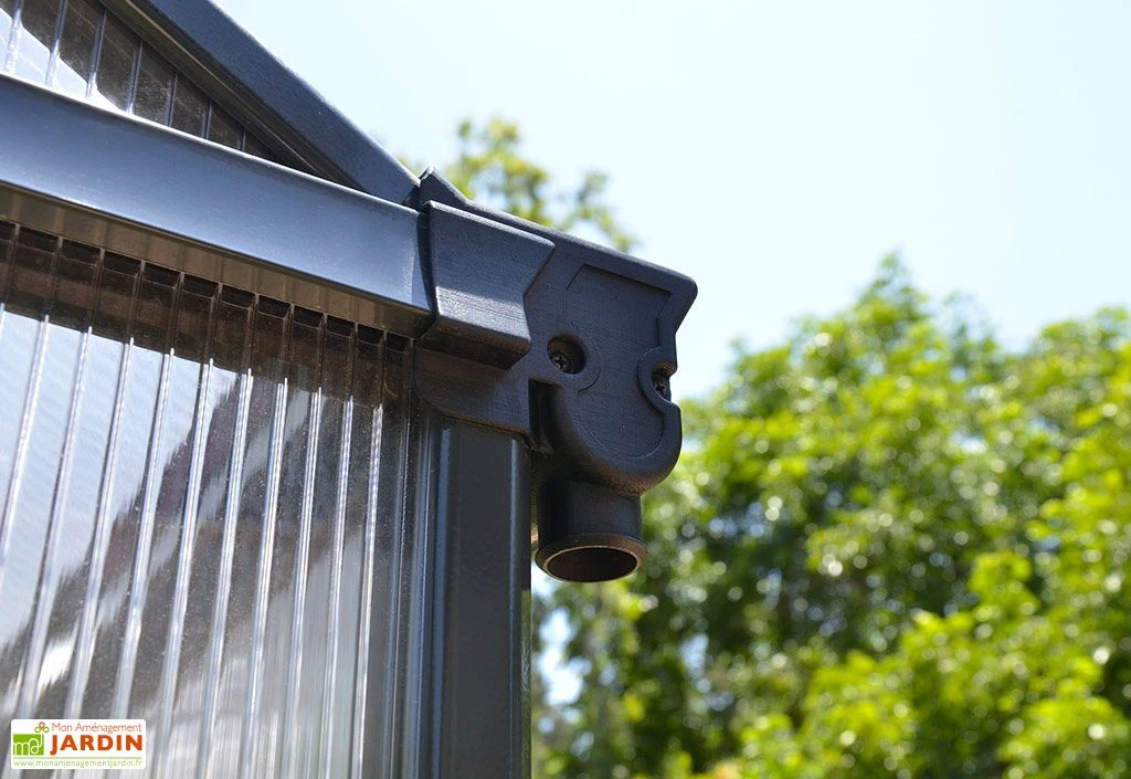 La serre de jardin Glory est Ă©quipĂ©e d’une grille de ventilation Ă volets mobiles et d’une fenĂŞtre de toit avec ouverture automatisĂ©e (Ă partir de 12 – 15 °C). Ces deux ouvertures permettront de rĂ©guler le taux d’humiditĂ© ou la tempĂ©rature intĂ©rieure de la serre, tout en assurant une bonne circulation de l’air. Des gouttières de 3,2 cm de diamètre se chargeront quant Ă elles d’évacuer l’eau de pluie, mais permettent Ă©galement de rĂ©cupĂ©rer cette eau afin de la rĂ©utiliser pour l’arrosage de vos vĂ©gĂ©taux. Un kit d’ancrage intĂ©rieur et extĂ©rieur est Ă©galement inclus.
