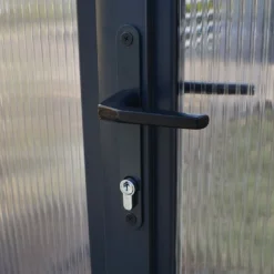 La structure de la serre est conçue en aluminium. 50% plus Ă©paisse et dotĂ©e de renforts, elle se montrera très solide et bien stable, notamment grâce Ă la prĂ©sence d’une base fabriquĂ©e en acier galvanisĂ©. Les doubles panneaux de polycarbonate qui Ă©quipent les parois et la toiture de la serre mesurent 10 mm d’épaisseur et sont pensĂ©s pour laisser passer la lumière naturelle tout en filtrant les rayons UV. Ces panneaux bĂ©nĂ©ficient Ă©galement d’un traitement anti-UV, et ne dĂ©coloreront donc pas au fil des annĂ©es.Â