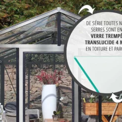Cette serre en verre mobilise une structure en aluminium, un matériau parfait pour l’extérieur puisqu’insensible à la corrosion. Cette structure est disponible dans différents coloris (voir plus bas) et repose sur une embase, elle aussi conçue en aluminium. Cette dernière permet non seulement de faciliter le montage de la serre, mais elle en assure également la bonne stabilité tout en évitant que les parois ne soient en contact direct avec le sol.