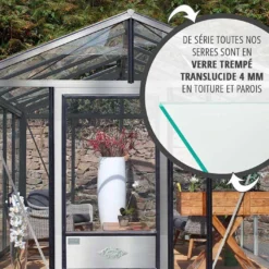 Cette serre en aluminium est donc dotée de parois en verre trempé de 4 mm d’épaisseur. L’avantage du verre trempé repose sur sa solidité et sur le fait qu’il se casse en petits morceaux non coupants en cas de bris. Il est donc en ce sens plus sûr que le verre horticole et permet par ailleurs une parfaite transmission de la lumière car totalement transparent. Vos cultures profiteront donc d’une belle exposition, la lumière étant un facteur déterminant dans le bon développement des végétaux.