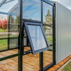 Les parois en verre trempé de cette serre en bois possèdent une épaisseur de 4 mm. Le verre trempé, bien plus résistant que le verre horticole, est sécuritaire puisqu’en cas de casse il se brisera en de nombreux morceaux non coupants. Les panneaux en verre sont fixés grâce à des barres en PVC et caoutchouc pour une étanchéité totale.