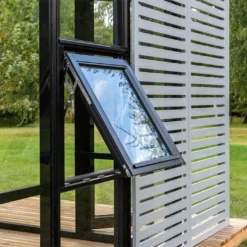 Cette serre en verre comprend deux fenêtres qui basculent vers l’extérieur et vers le haut et une grande double porte battante avec poignée. La porte et les fenêtres vous permettent d’aérer facilement la serre et de contrôler ainsi la température et le taux d’humidité.