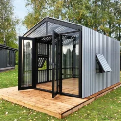 Cette serre en verre est équipée de 2 fenêtres basculant vers l’extérieur et vers le haut. Les fenêtres sont dissimulées sous les panneaux occultants mais restent parfaitement fonctionnelles. La structure comprend également une double porte battante avec poignée. Ces équipements vous permettent de contrôler facilement la température et le taux d’humidité sous la serre.