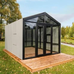 Cette serre de jardin en bois Stali est fabriquée en Lettonie. Ses parois en verre trempé sont couvertes de panneaux occultants offrant intimité et ombre à l’intérieur de la serre. La structure en bois et les panneaux occultants sont fabriqués en pin qualité AA, certifié sans nœud et imprégné pour une excellente résistance face aux agressions extérieures. Vous pouvez choisir la couleur du bois parmi de nombreux RAL.