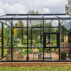La serre en bois est dotée de parois en verre trempé securit de 4 mm d’épaisseur. Bien plus résistant que le verre classique, le verre trempé securit est également moins dangereux s’il vient à casser puisqu’il se brise en de multiples morceaux non coupants. Les plaques de verre sont fixées sur la serre avec des barres en PVC et caoutchouc haute qualité, assurant une excellente étanchéité.