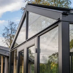 Côté équipement, elle comprend 2 fenêtres basculantes (vers le haut et l’extérieur) et une grande double porte battante avec poignées (ouvrant vers l’extérieur) qui permettront de réguler facilement la température et le taux d’humidité à l’intérieur de la serre. Toute la quincaillerie est incluse, elle est signée ASSA Abloy et Spilka.