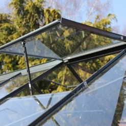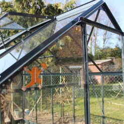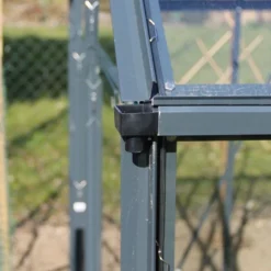 Côté ouvertures et aérations, cette serre en verre s’est vue dotée d’une porte coulissante de 60 x 170 cm et de deux lucarnes de toit. Ces dernières permettront à l’air de bien circuler. L’ensemble est livré accompagné de six pattes d’ancrage, de toute la visserie nécessaire au montage de la serre et de clips en inox.