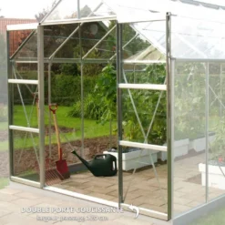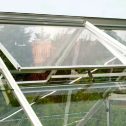 La serre en verre est équipée d’une grande double porte coulissante de 120 x 190 cm (l,h). Elle comprend également des lucarnes de toit pour aérer facilement l’intérieur de la serre, faire baisser la température et limiter l’humidité.