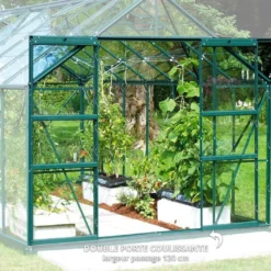 La serre en aluminium est équipée d’une grande porte coulissante de 120 cm de largeur et de 190 cm de hauteur. Elle est également équipée de 4 lucarnes. Ces fenêtres de toit permettent d’aérer parfaitement l’intérieur de la serre, de limiter l’humidité et de faire baisser la température.