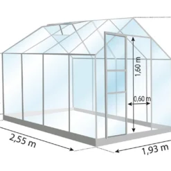 La serre de jardin en verre de chez Lams mesure 2,55 m de longueur pour une largeur de 1,93 m et une hauteur de 2,08 m (dimensions extérieures). Elle dispose d’une structure en aluminium vert laqué qui ne craint pas la moisissure, les insectes ni la corrosion. Ses parois sont en verre trempé de 3 mm d’épaisseur. Elle est constituée de verres de petite taille qui vous permettent de les poser plus facilement.