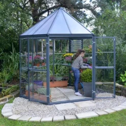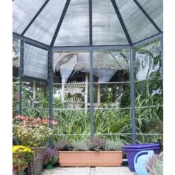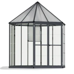 La serre de jardin Oasis est conçue pour vous permettre de cultiver vos plantes dans les meilleures conditions possibles. Elle possède une Ă©lĂ©gante structure hexagonale et affiche un design qui facilitera son intĂ©gration dans votre jardin. Cette structure est fabriquĂ©e en aluminium, un matĂ©riau qui assure soliditĂ© et rigiditĂ©, et repose sur une base en acier galvanisĂ©, pour une stabilitĂ© accrue. Ces mĂ©taux Ă©tant insensibles Ă la corrosion, la serre Oasis ne craindra pas la rouille, mĂŞme sans entretien. L’aluminium est peint en gris anthracite RAL 7016.Â