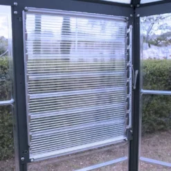 Les parois et la toiture de cette serre de jardin sont composées de deux types de panneaux de polycarbonate afin de proposer une exposition plus harmonieuse. Les parois, transparentes, laissent en effet passer plus de 90% de la lumière naturelle, tandis que le toit est constitué de doubles panneaux, plus opaques, chargés de protéger vos plantations d’une surexposition au soleil. Si ces panneaux laissent passer la lumière, ils filtrent toutefois les rayons UV. Les parois possèdent une épaisseur de 0,7 mm et la toiture possède une épaisseur de 4 mm.