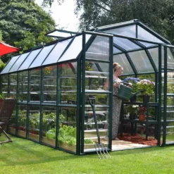 La serre de jardin en polycarbonate de chez Palram-Canopia mesure 3,89 m de longueur, 2,67 m de largeur et 2,37 m de hauteur. Il s’agit du modèle Grand Gardener 8 x 12. Sa structure est en PVC vert résistante à la moisissure, à la corrosion ou encore à l’attaque d’insectes sans demander aucun entretien. Elle offre une bonne isolation à la serre. Sa toiture à la forme originale permet d’offrir une hauteur de travail confortable et agréable.