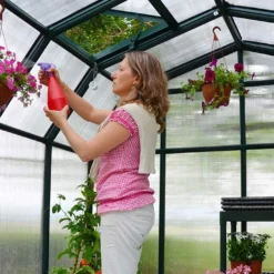 Les accessoires ne sont pas inclus (Ă©tagères, suspension pour pot de fleurs…). Ils permettent de mettre en scène l’utilisation de la serre.