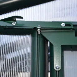 La serre de jardin possède des panneaux en polycarbonate double paroi de 6 mm d’épaisseur pour les murs et une toiture en panneaux de polycarbonate double paroi de 4 mm d’épaisseur. Le polycarbonate est pratiquement incassable grâce Ă sa grande flexibilitĂ©. Il rĂ©siste aux UV (Ă©vitant la dĂ©coloration) et les filtre Ă 100% tout en laissant pĂ©nĂ©trer la lumière qui Ă©claire et rĂ©chauffe l’intĂ©rieur de la serre.Â