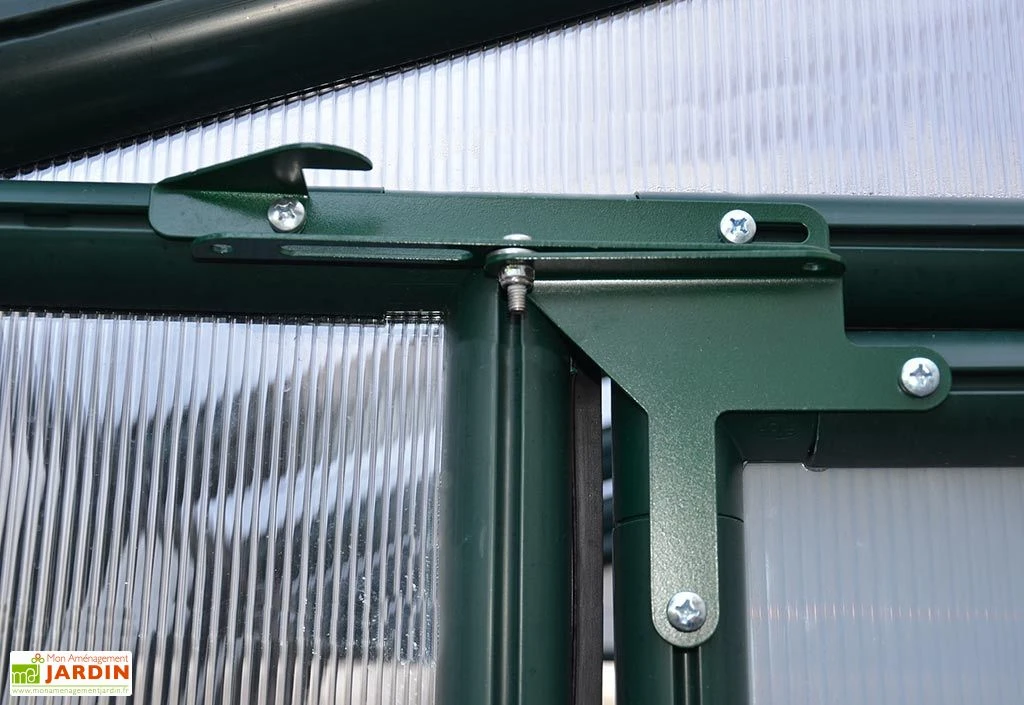 La serre en polycarbonate est Ă©quipĂ©e de 4 fenĂŞtres de toit et d’une grande double porte qui permettent d’aĂ©rer l’intĂ©rieur de l’abri et ainsi de contrĂ´ler facilement la tempĂ©rature et l’humiditĂ©. La double porte mesure 119 cm de largeur pour 165 cm de hauteur. MontĂ©e sur charnières, elle dispose d’une poignĂ©e et de supports permettant de la bloquer.Â