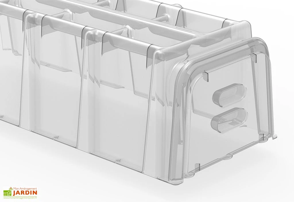 Le tunnel de forçage dispose de parois rigides de 2 mm d’Ă©paisseur, accentuant l’effet de serre et maintenant les cultures Ă l’abri des gelĂ©es printanières et des animaux nuisibles. Les bacs de rĂ©cupĂ©ration d’eau de pluie ou d’arrosage sont intĂ©grĂ©s et aucune manutention n’est utile durant la pĂ©riode forçage.
