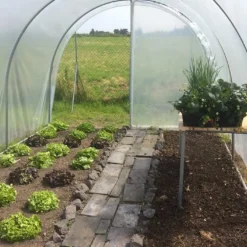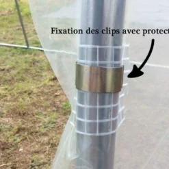 La serre tunnel est recouverte d’une bâche en polyéthylène translucide de 200 microns d’épaisseur. La bâche, non armée, est traitée contre les UV. Elle dispose d’ourlets et d’une corde qui assure une tension parfaite. Une soudure permet de renforcer la sortie de la corde à chaque ourlet. La bâche est marquée pour permettre de la positionner facilement au centre de l’armature.