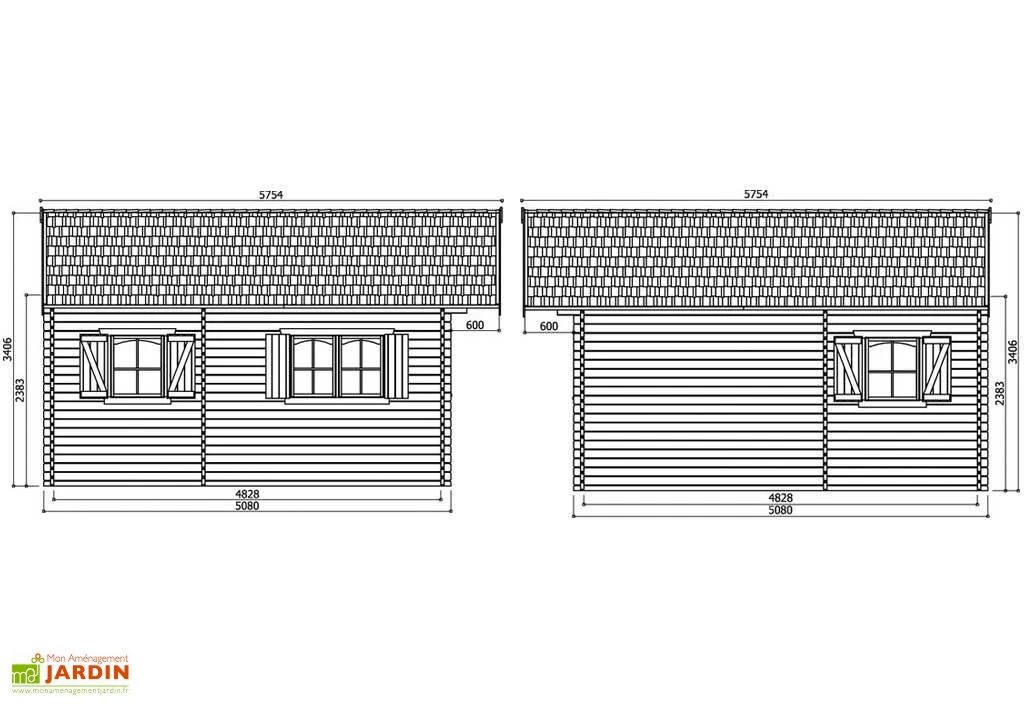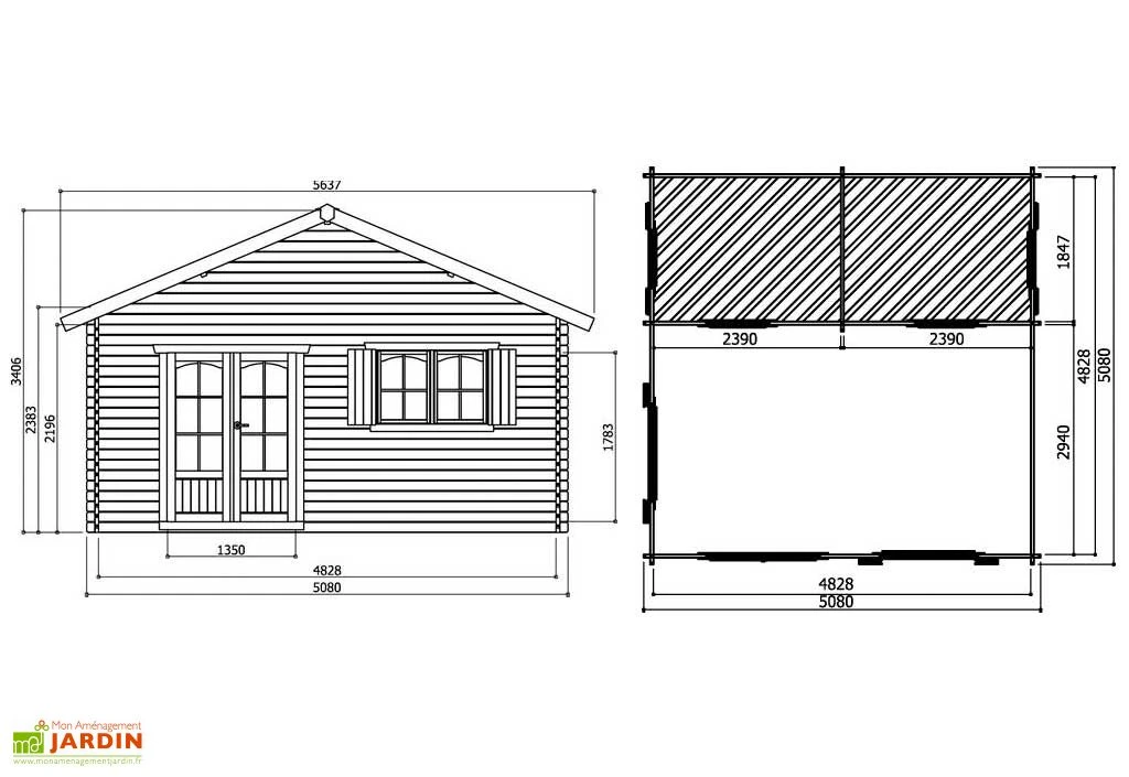 Le chalet a une avancĂ©e de toit de 60 cm ce qui donne une surface de 32,44 m² hors tout. Le toit a une inclinaison Ă 23° et est recouvert de shingles rouges. Vous pourrez, si vous le souhaitez, acheter d’autres bardeaux bitumĂ©s verts ou noirs que vous trouverez dans vos accessoires.Â